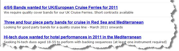 Подобные объявления приходят каждый день. Это говорит о том, что многие музыканты плохо представляют себе механизм трудоустройства на круизный лайнер. Сегодня существует масса вакансий! Я не раз утверждал, и продолжаю утверждать, что работа для музыкантов за границей есть всегда! Вот, посмотрите: